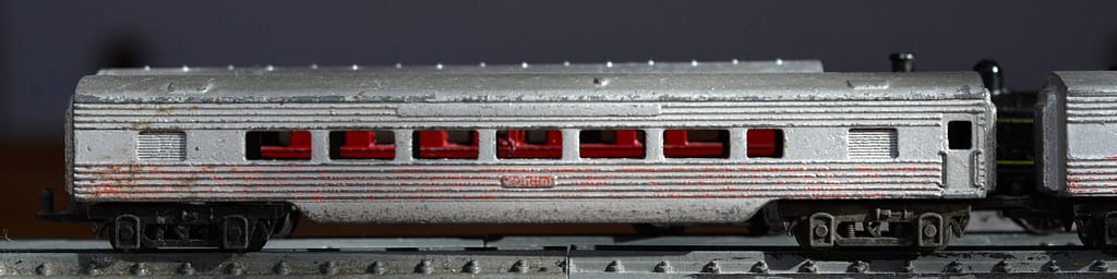 The coach body was diecast in the white metal alloy zamak and mounted on a pair of bogies, which were diecast in a steel alloy.