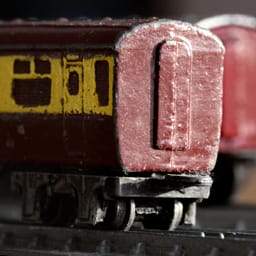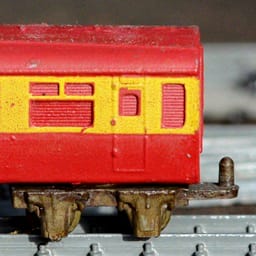 The coach body was diecast in the white metal alloy zamak. This was mounted on a pair of bogies, which were diecast in a steel alloy, made up of two pairs of flanged wheels. The bogies were different castings for the coupling, the leading one had a pin and the trailing one had a towing slot.