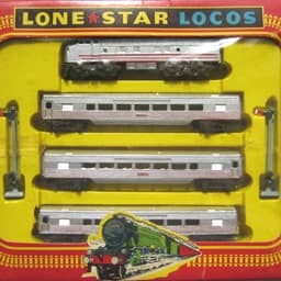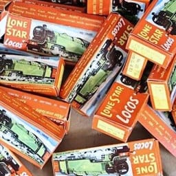 With its window front showcasing the contents, the cardboard border was composed of a railway track with 000 on the sides. At the top was headed with Lone Star Locos and the bottom an express train hauled by a 4-6-2 locomotive.