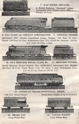 The first pamphlet had drawings of the first seven items of rolling stock but these were soon replaced with photos of the full 000 range of rolling stock, track and trackside products. Locomotives had quite a comprehensive description alongside their picture, with the exception of the American Transcontinental Diesel.